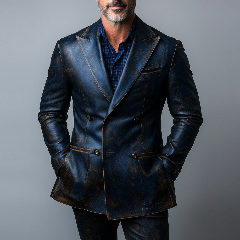 Men's Retro Peak Lapel Patchwork Alligator Pattern PU Leather Blazer