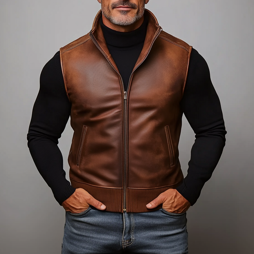 Men's PU Leather Stand Collar Slant Pocket Zip Up Vest