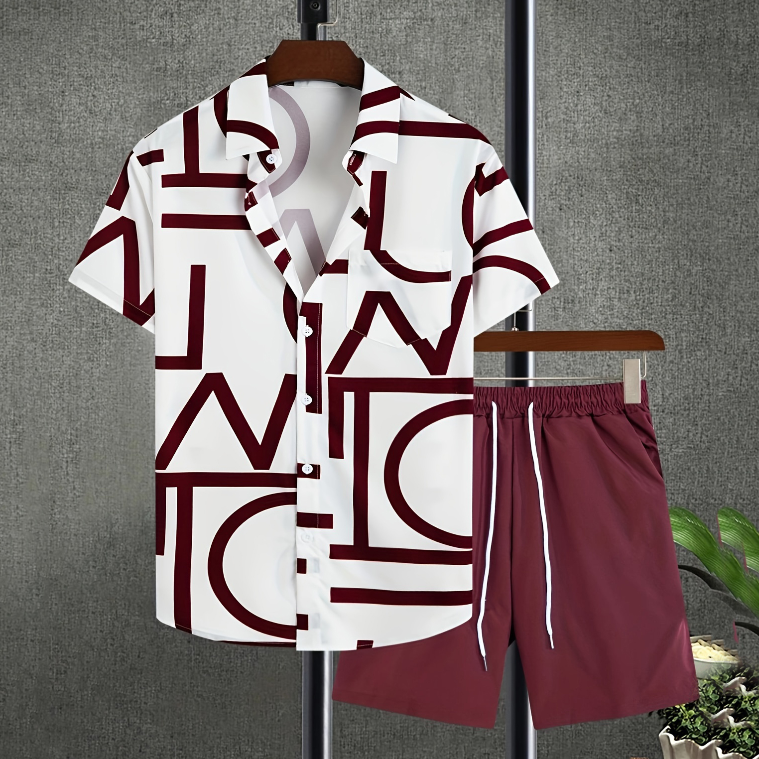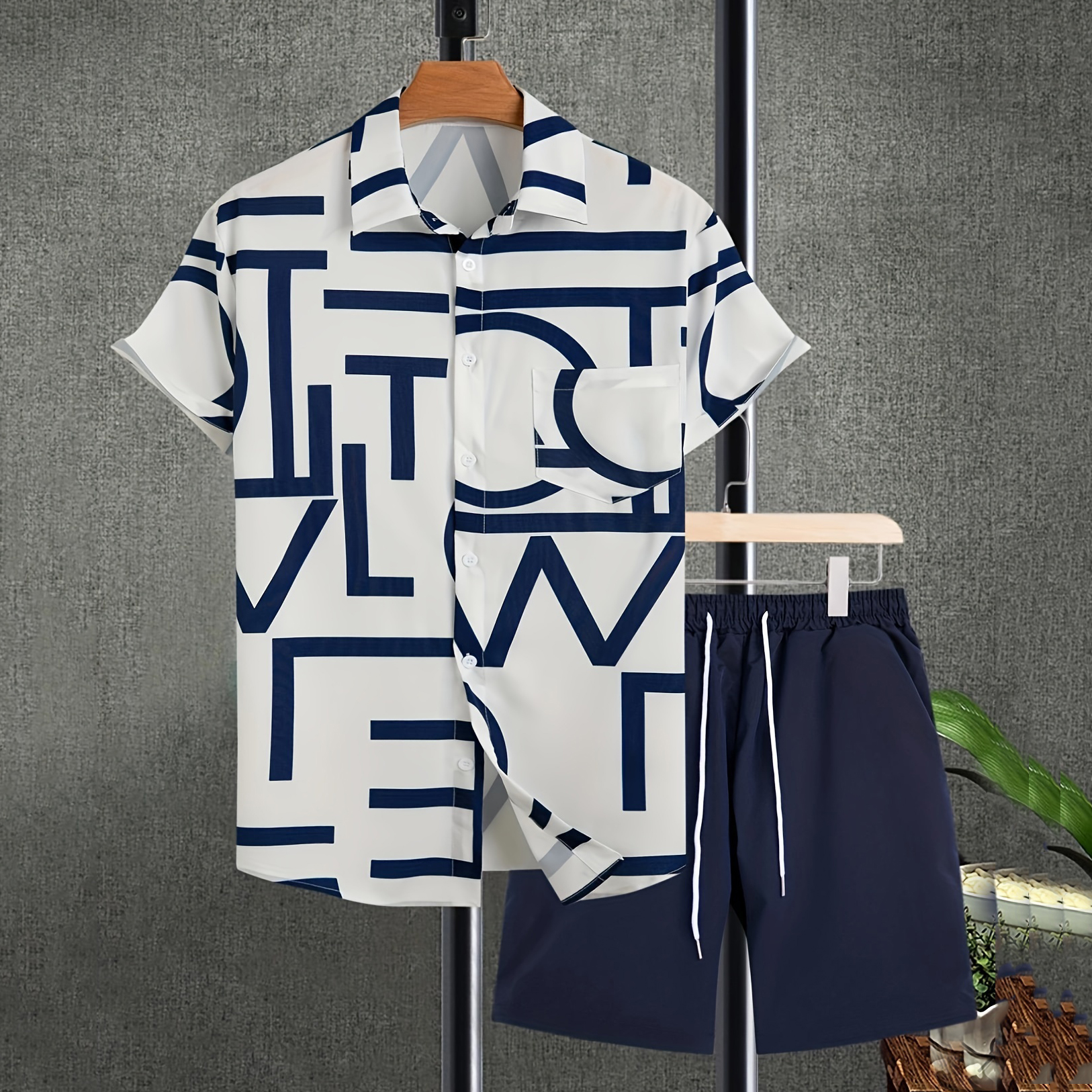 Men's Casual Geo Pattern Short Sleeve Shirt & Shorts 2Pcs Set