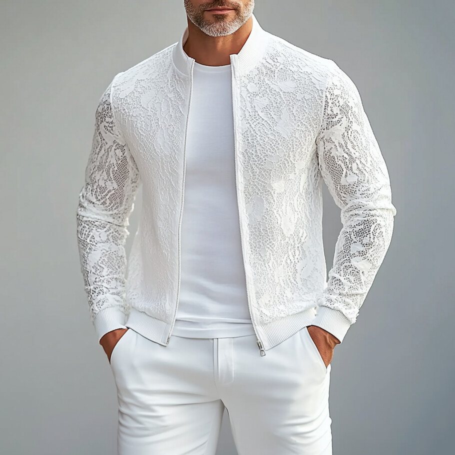 Men's Stand Collar Long Sleeve Hollow Out Knitted Zip Up Jacket